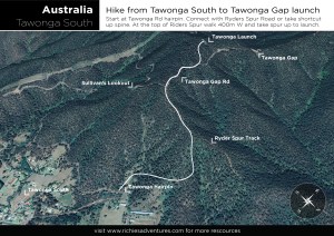 A map detailing the walk from from the hairpin on Tawonga Rd to Tawonga Gap launch. This launch is located close to Mount Beauty in the scenic alpine region of Victoria. Click for a larger image
