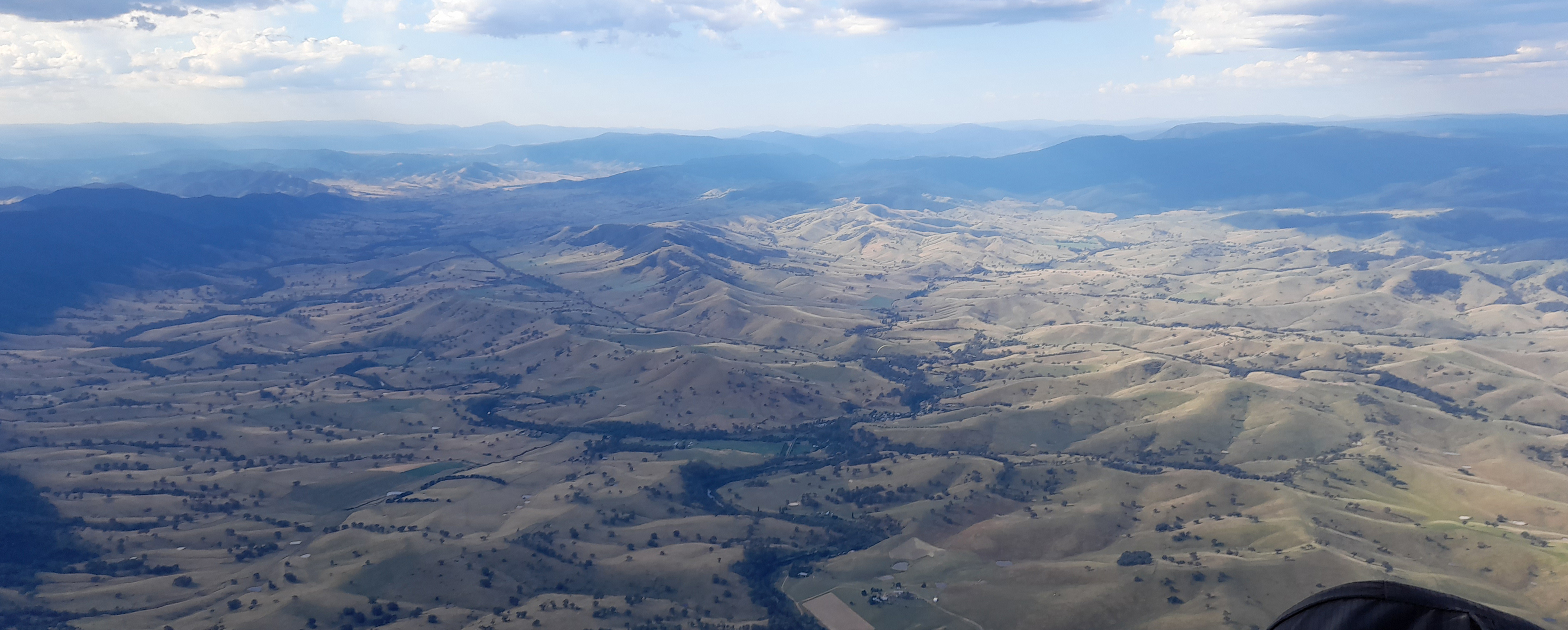 Any epic flight has at least one low save right? We had two of them. The first was when Scotty was 143m off the terrain over the southern end of the Razorback. He connected to an obvious thermal trigger and found a solid +2m\s thermal, making it a much easier exercise for Grum and I as we were slightly higher and flew straight to him. From this point, we concentrated on climbing as high as possible. When we reached base we went on glide, spanning out to find buoyant lines and lifting air.