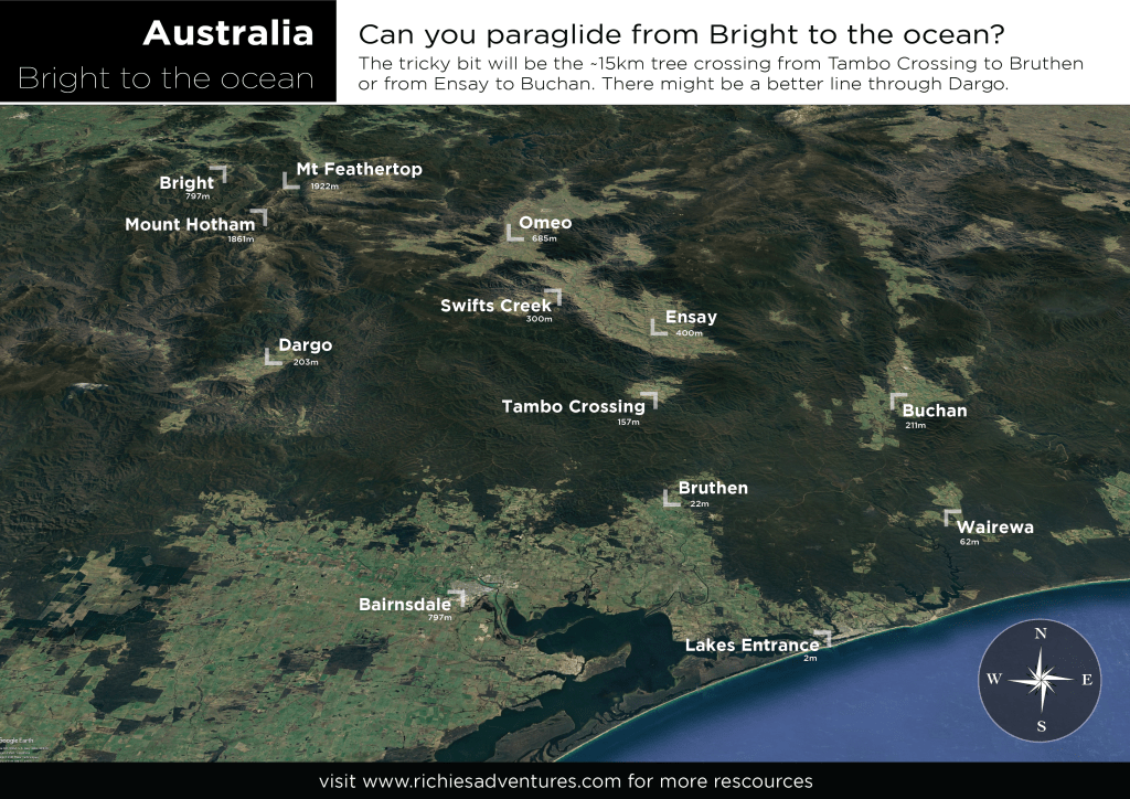 Five years earlier I set a goal to fly from Bright to Omeo. Back then I didn’t have the ‘know-how’ or the skills – was it just a pipe dream? I have only heard of four people successfully making the flight. It is seldom done for a few reasons. Firstly, it takes a committing line due South from Mount Feathertop, along the Razorback, to Mount Hotham, then Southeast along the high plains before dropping down into Omeo. There are no landing options below the Razorback ridge so you need to be prepared to top land and walk out if you don’t find a thermal. Secondly, Bright is a two-hour drive from Omeo so getting back requires either preplanning or very good luck hitching. Hitching isn’t guaranteed these days due to that feisty Miss Rona, so having an understanding partner or good friend (who enjoys driving) is by far the best option. Finally, the right conditions might appear only a couple of times per season. All these factors make the 67km (as the crow flies) flight a rarity.