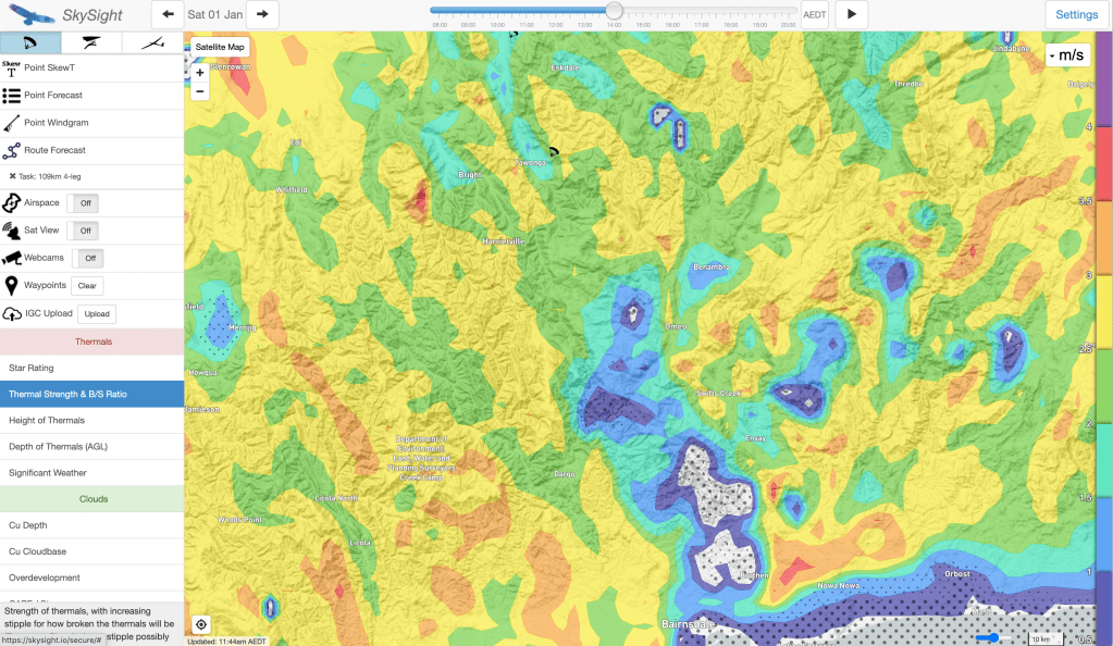 Could we have flown to the coast? Maybe. I think if we were 2000m above the terrain at Tambo Crossing we could have made the glide to Bruthen (with current wind direction). The possibility of overdevelopment was a concern, one we didn’t realise fully until after we landed and heard the clap of thunder.