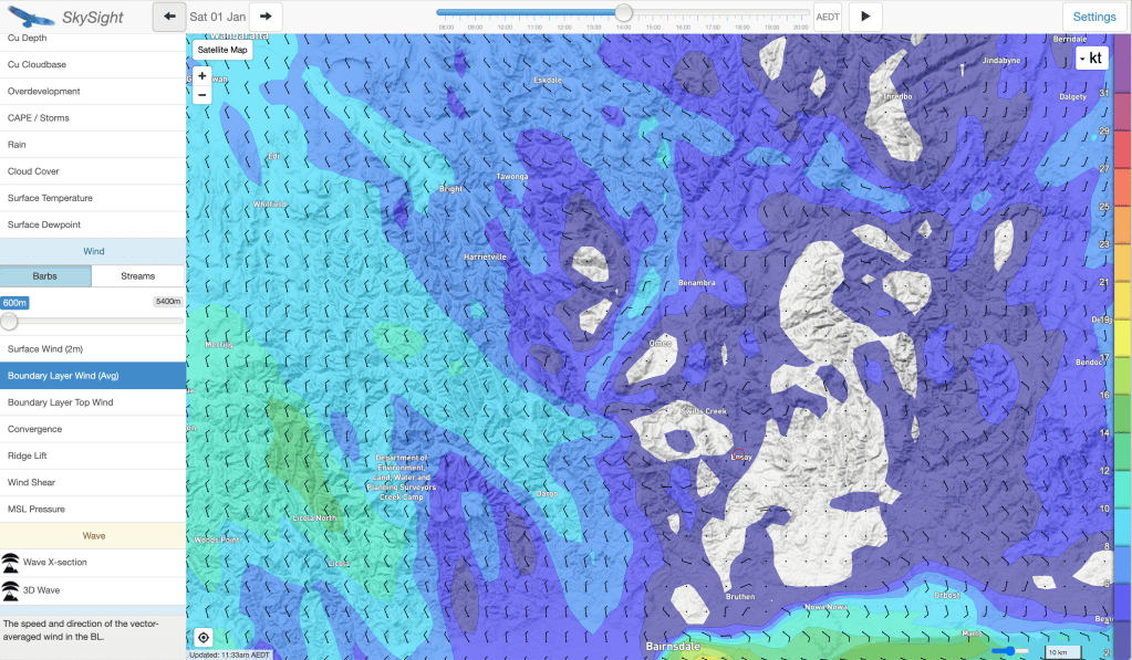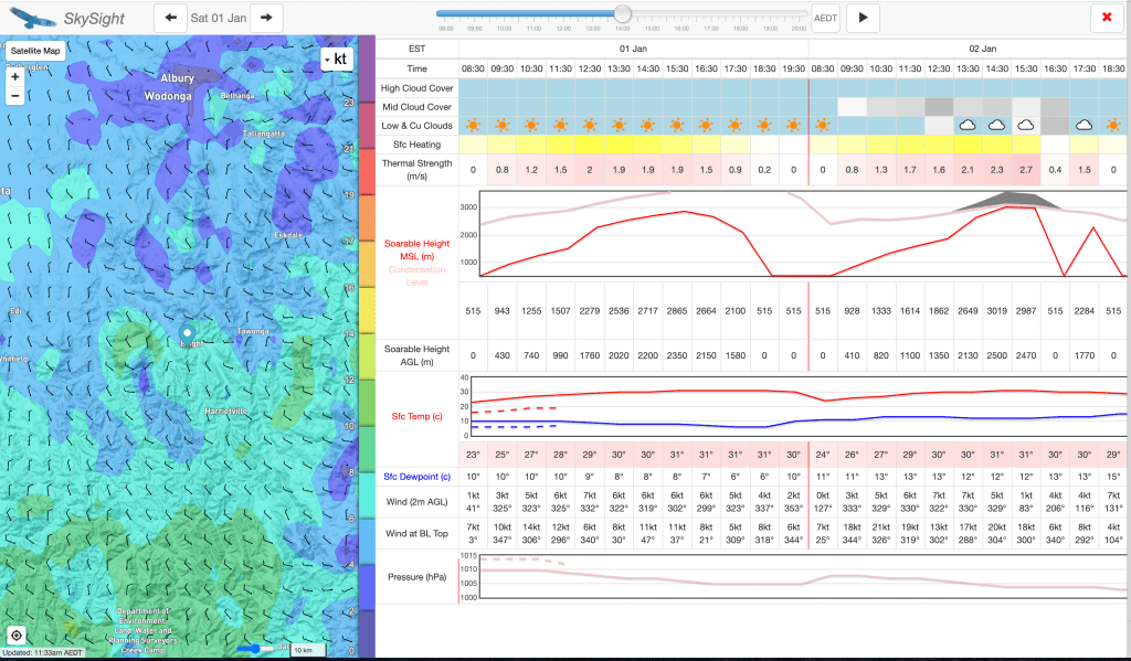 The 2022 New Year’s celebrations wound down at around 3am. We’d danced like disco stars and sunk many a bevvie, and the next day Scotty and I felt pretty dusty. Paragliding was the last thing I felt like doing but the forecast was a dream: 35 degrees in Bright with light Northerlies on the ground and at cloud base, which was forecasted to be +3000m. This is great as you need a high base once you connect to the Hotham high plains, where the ground is +1500m above sea level (Mount Hotham sits at 1861m). We had to give it a go! I planned to land early if I wasn’t in the right headspace. We had concerns about getting back for a commitment the next morning, but the amazing Aline and Donna graciously offered to retrieve us. It was on!