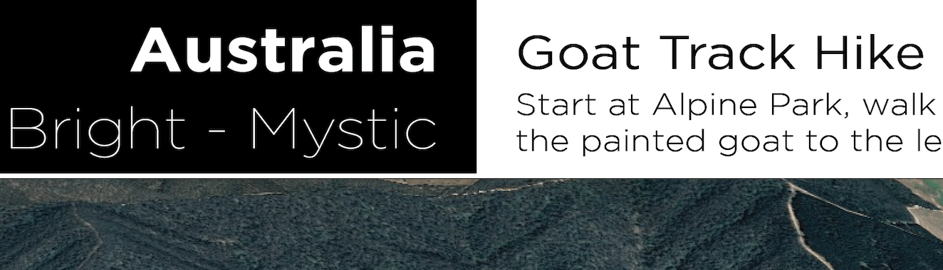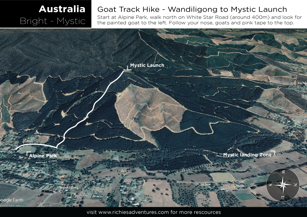 Start at Alpine Park, walk north on White Star Road (around 400m) and look for the painted goat to the left. Follow your nose, goats and pink tape to the top. Download the KML/KMZ file here.